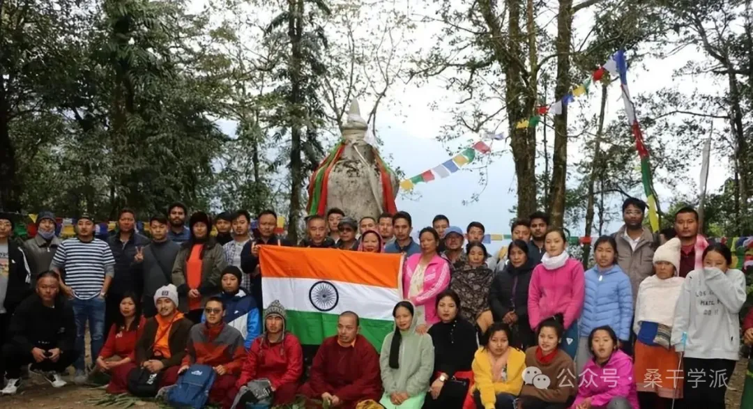 下圖為印度統治下的南墨脱縣當地門巴、珞巴等族羣眾,來自都登等地,集體在更巴拉山脊上,簇擁着一座寧瑪派佛塔為背景,張大一面印度🇮🇳國旗,照相合影留念。從照片來看,基本都是黃種人面孔,鮮有真正的印度🇮🇳斯坦人(僅兩三人)。