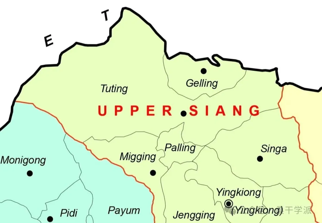 下圖為印方的偽阿魯納恰爾邦(Arunachal Pradesh)偽上桑朗縣(upper siang) 地圖。所謂的gelling即更仁,所謂的tuting即都登,所謂的palling即邦勾,所謂的migging即米根。
