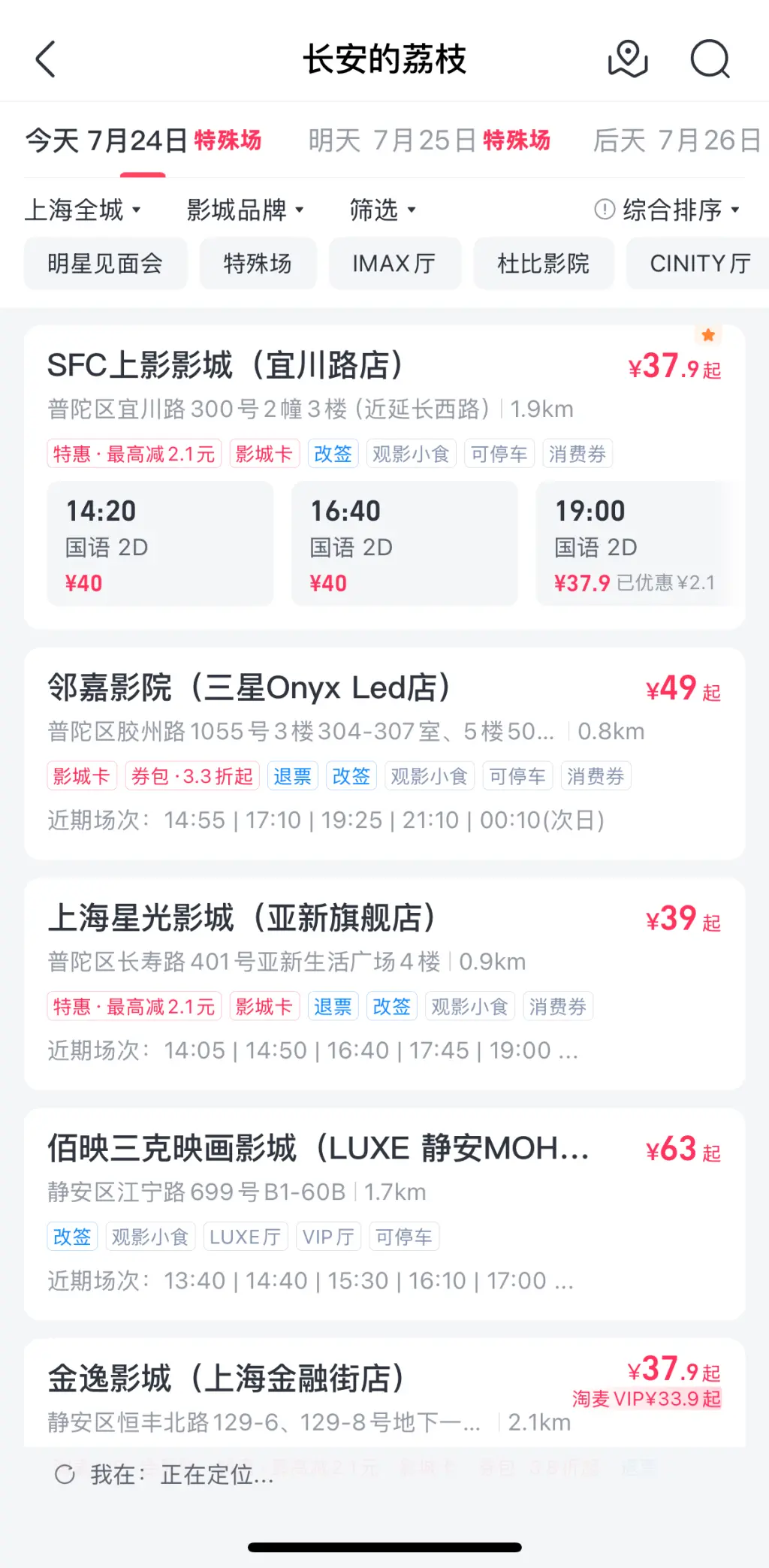 為了實測購買電影票後能不能退票、退票難不難,澎湃新聞“馬上測”分別在淘票票、貓眼、美團、大眾點評、京東選擇SFC上影影城(新世界店)、佰映三克映畫影城、國泰電影院、上海星光影城亞新店購買了暑期檔熱門電影《長安的荔枝》24小時內相近場次的電影票。