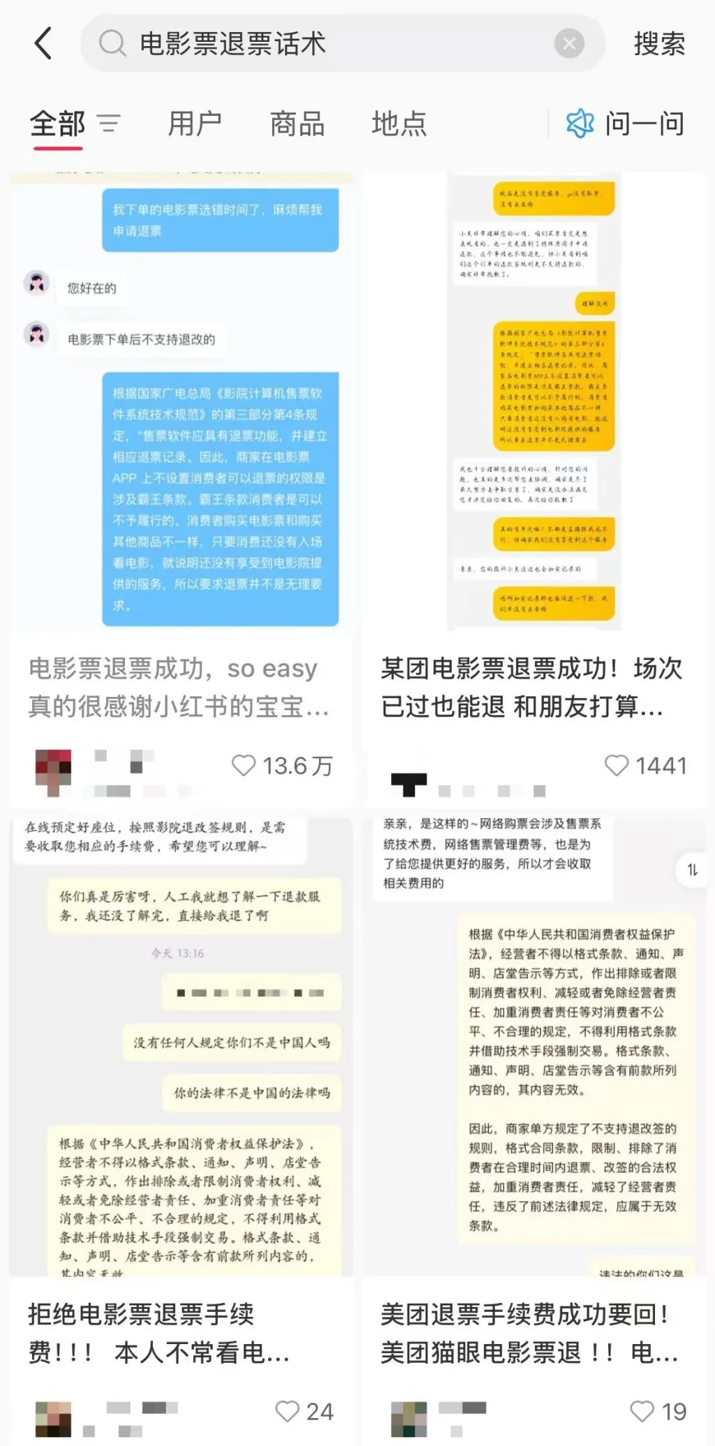 社交平台上也有不少網友吐槽退票難。甚至有網友分享退票小妙招,比如向客服投訴並告知國家廣電總局出台的《影院計算機售票軟件系統技術規範》規定,將關於“售票軟件應具有退票功能,並建立相應退票記錄”的文字發送給客服後,就能順利退款等等。