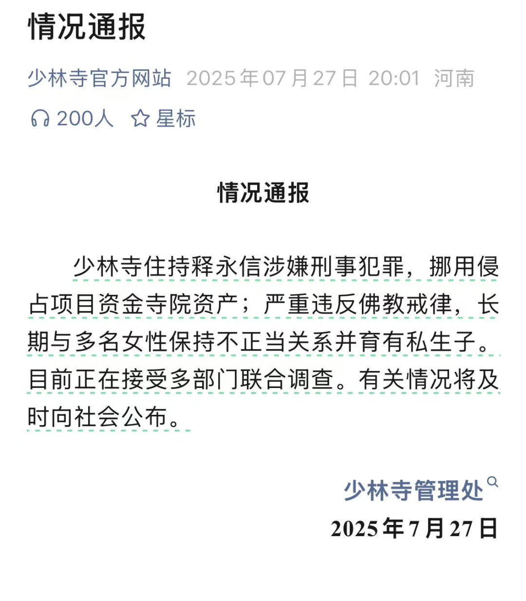 而根據少林寺官方公眾號的聲明:少林寺住持釋永信涉嫌刑事犯罪,挪用侵佔項目資金寺院資產;嚴重違反佛門戒律,長期與多名女性保持不正當關係並育有私生子,目前正在接受多部門聯合調查。