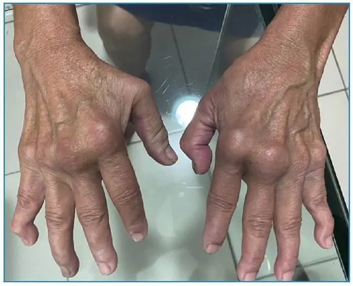 下圖是巴西一項研究裏的患者,她手部對稱性多發性關節炎,是一個讓人很容易聯想到類風濕關節炎的典型例子。