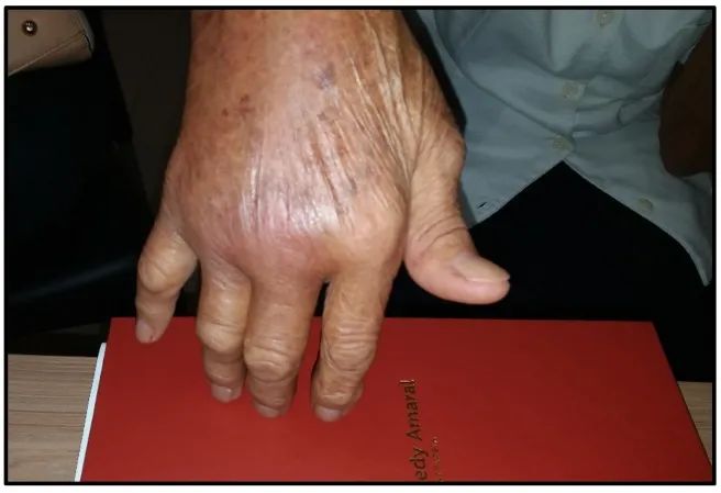 女性,82 歲,感染 基孔肯雅熱後 2 年。掌指關節和手腕的嚴重關節炎。