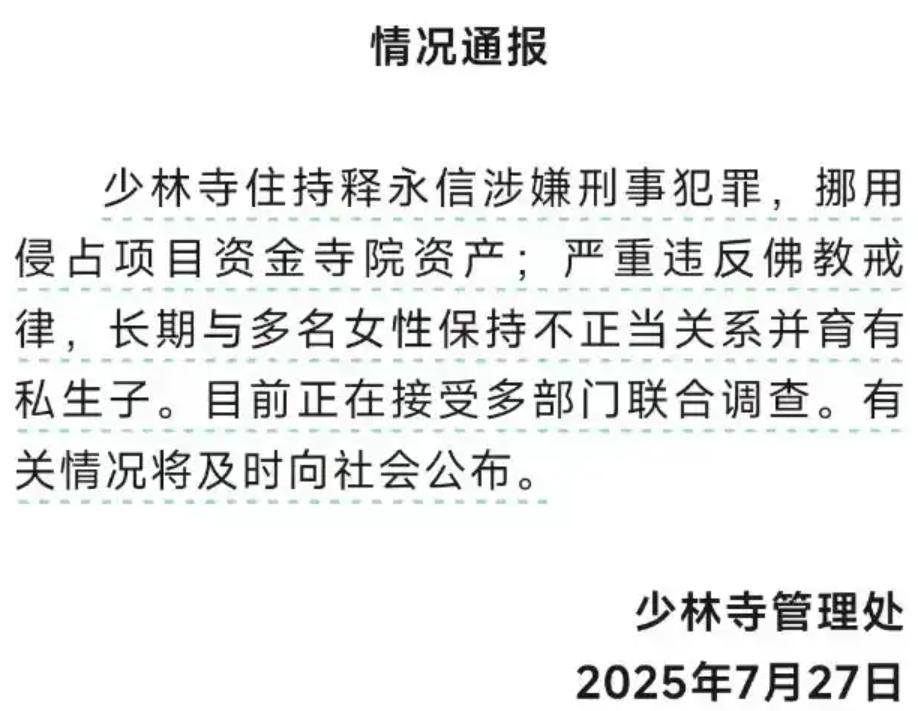 就在昨天(7月27日),少林寺官方突然宣佈釋永信因涉嫌挪用資金、違反戒律被調查,坐實了十年前的部分傳聞,將這場博弈推向高潮。