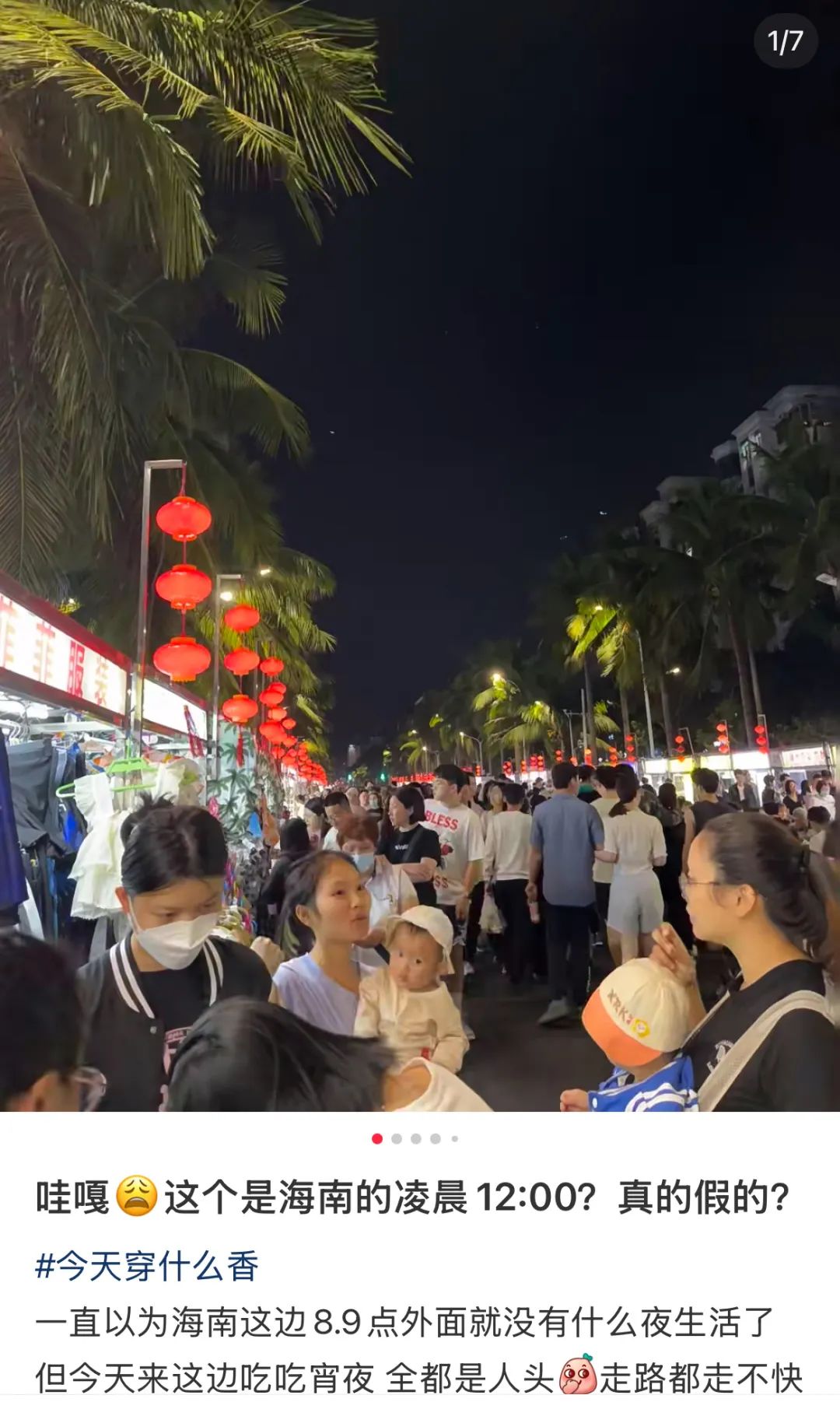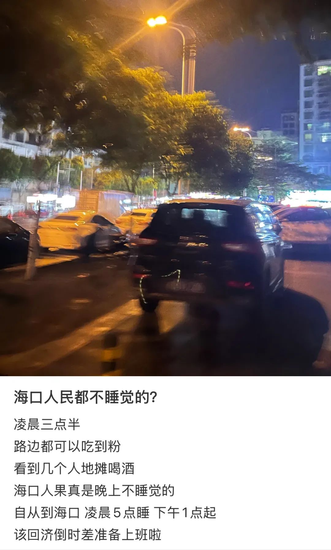 一位東北老鐵,篤信海南沒有夜生活,結果凌晨出門時,發現附近的夜市燈火通明、人潮洶湧,喧囂程度竟然勝過晚上8點。