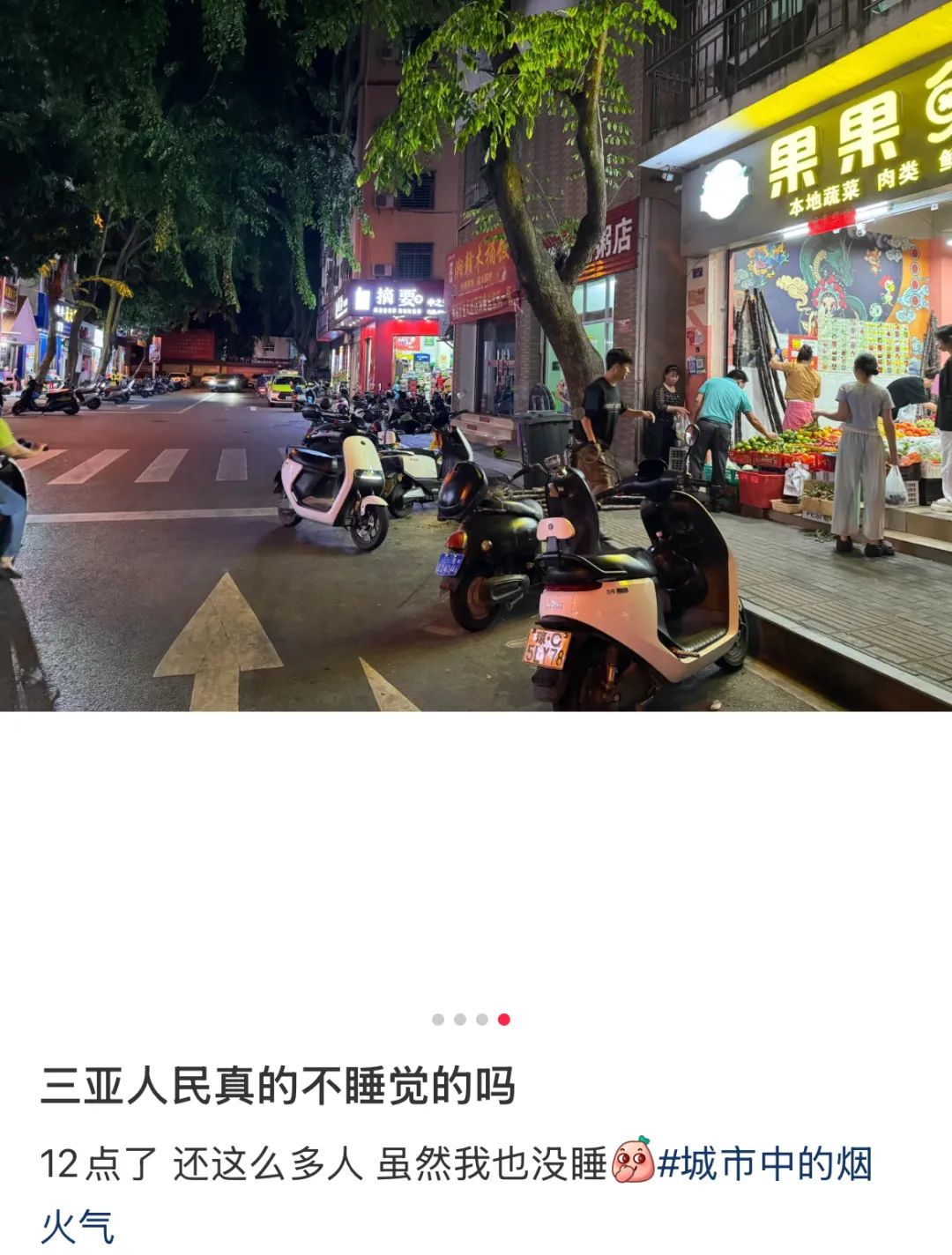 有人12點來到居民區,看見沿街的水果攤、大排檔、小賣部全都開着門,且門口停着一排的電瓶車。如果不特別註明時間,估計沒人相信這是深夜12點的居民區;