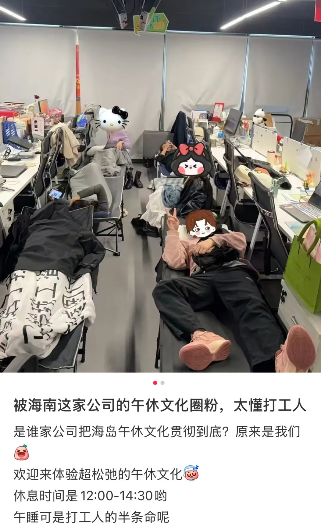 因此,當12點的鐘聲響起時,海南全島的寫字樓都會自動切換成“休眠模式”,燈光盡數熄滅、窗簾紛紛落下、走廊秒變大通鋪、會議室化身集體宿舍。如果有外地客户或老闆中途打來電話,他們大概率也只會收到一句:“天大的事,睡醒再説!”