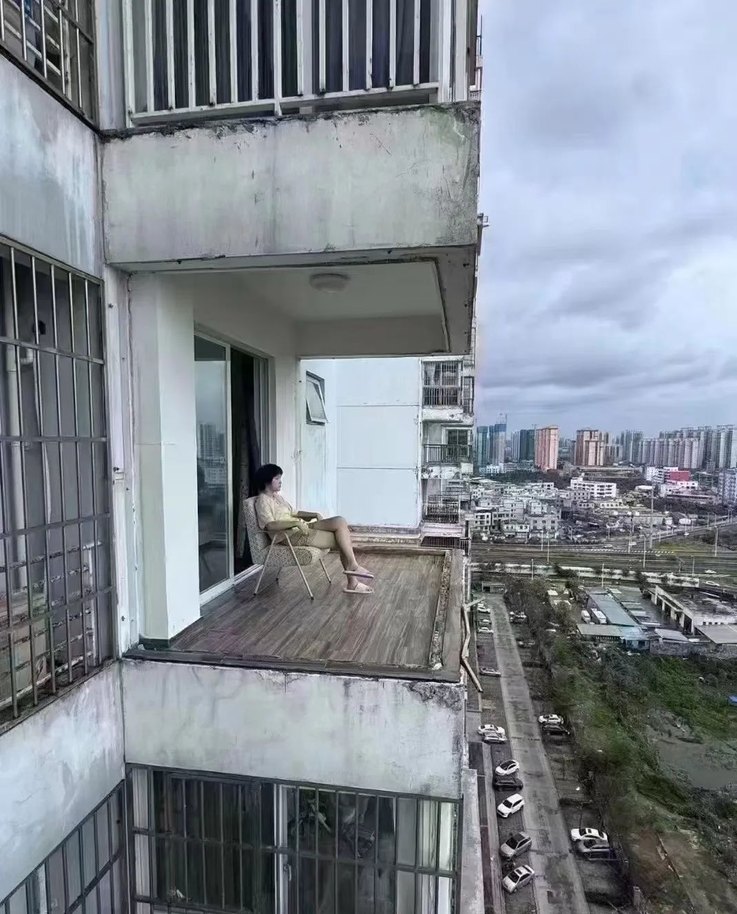 還有這一位,狂暴的颱風把陽台欄杆都刮沒了,她卻神情淡然地坐在椅子上欣賞風景。身後是家財房產,眼前是數丈深淵,如此強大的心理素質,實在令人歎為觀止。