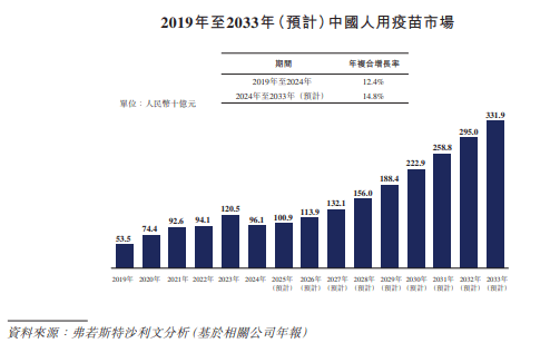 據弗若斯特沙利文數據,2019年-2024年,中國人用疫苗市場由535億元增長至961億元,年複合增長率為12.4%,其2024年規模為全球市場的27%。弗若斯特沙利文預計,在創新疫苗預期持續推出的推動下,中國人用疫苗市場預期於2033年進一步增長至3319億元,2024年至2033年的年複合增長率為14.8%。