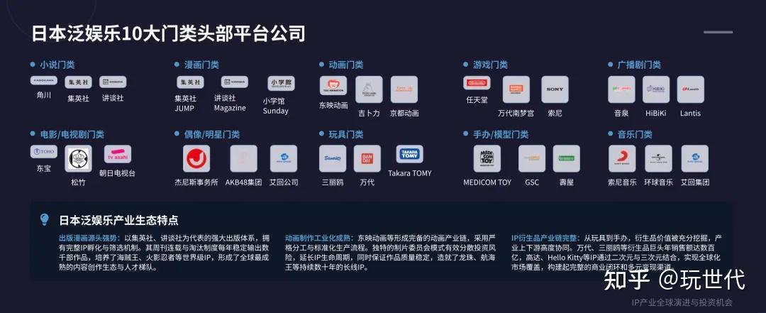 動漫門類,最前面是出版社,所以是從集英社、講壇社、小學館開始的;小説的話就是角川;動畫門類,比如吉卜力。玩具門類,這邊要關注的是三麗鷗,萬代和TAKARATOMY,這幾家上市公司。