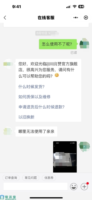 7月8日,廣東省的吳女士向電訴寶投訴稱其於今年5月28日在有贊平台上購買了一台全新的攝像機,首次使用時發現設備始終無法開機,隨即聯繫品牌售後商城反饋問題。然而,售後渠道全程由機器人應答,僅要求用户留下手機號碼並承諾“48小時內回覆”,但用户多次提交信息後均未收到任何電話或解決方案。