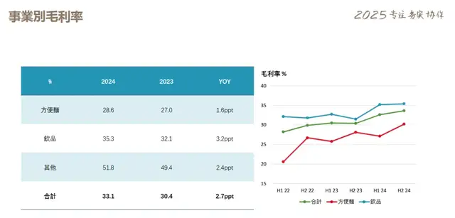 2024年,方便麪營收佔比已下降至35.2%,而飲品營收佔比則攀升至64%,成為支撐營收的重要支柱。