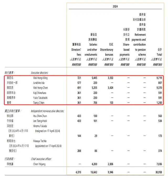 2024年,公司11名高管共領取3095.8萬元薪酬,魏宏名、魏宏丞年薪分別高達971.9萬元、937萬元,行政總裁陳應讓年薪703.6萬元,兩名獨立董事年薪也都超過了50萬元。