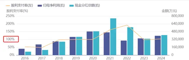 根據同花順iFinD數據,2020年至2024年,公司的股利支付率(淨利潤中現金股利分配比例)分別為100.54%、100.68%、161.62%、192.26%、97.72%、103.50%。