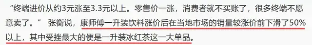 去年3月,康師傅突然宣佈漲價,1升裝飲料的進貨價從3元漲至3.3元,終端零售價從4元漲到5元。