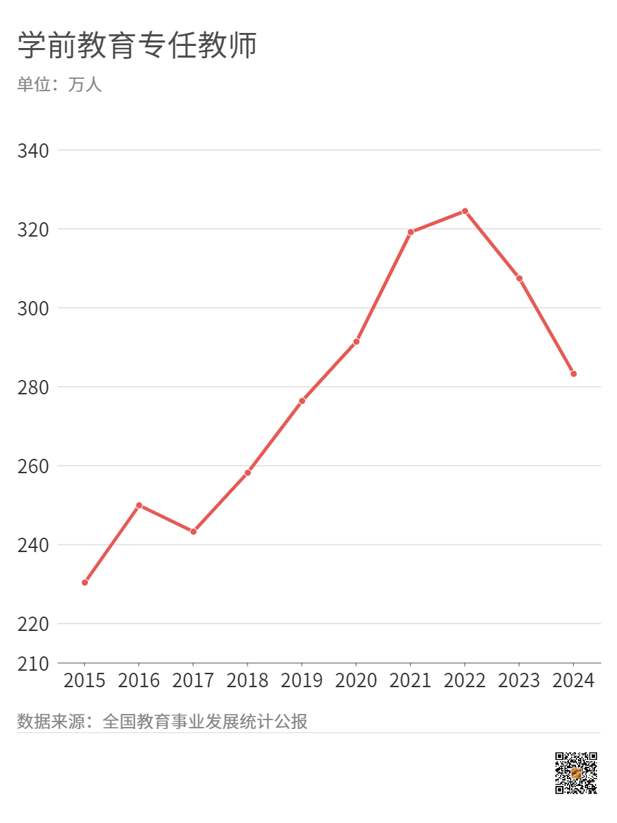 幼兒園的大量出清,落到普通幼師頭上,就是失業。從2022年達峯後,幼師數量就以每年幾乎20萬人的數量縮減。