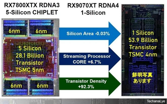 搭載RDNA 4 的 GPURadeon RX 9070 XT(右)和上一代 RDNA 3 GPURadeon RX 7800 XT(左)來源:Techanalye 報告