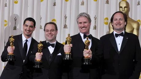 △ 2009年2月22日,在第81屆奧斯卡頒獎典禮上,埃裏克·巴爾巴(Eric Barba)、史蒂夫·普雷格(Steve Preeg)、布爾特·達爾頓(Burt Dalton)、克萊格·巴朗(Craig Barron)(從左至右)憑藉電影《本傑明·巴頓奇事》的視覺效果成就,在後台領取他們的奧斯卡獎。