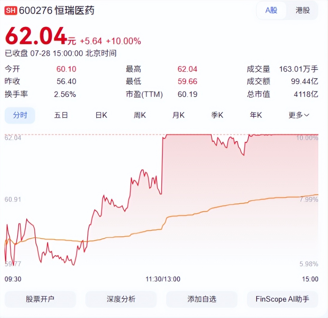 7月28日,恆瑞醫藥漲停封板,A股股價大漲10%,報62.04元/股,市值也達到了4118億元。這背後,一筆“打包式”BD(商務拓展)點燃了市場。