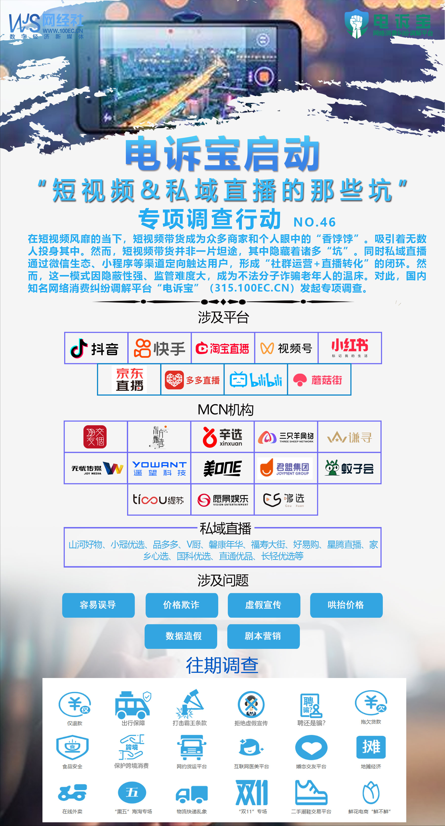 早在2個月前,為了淨化短視頻帶貨環境,為消費者提供直播購物的避坑指南,網經社旗下消費糾紛調解平台“電訴寶”發起“短視頻帶貨的那些坑”專項調查行動。也是電訴寶的第46次專項調查行動。