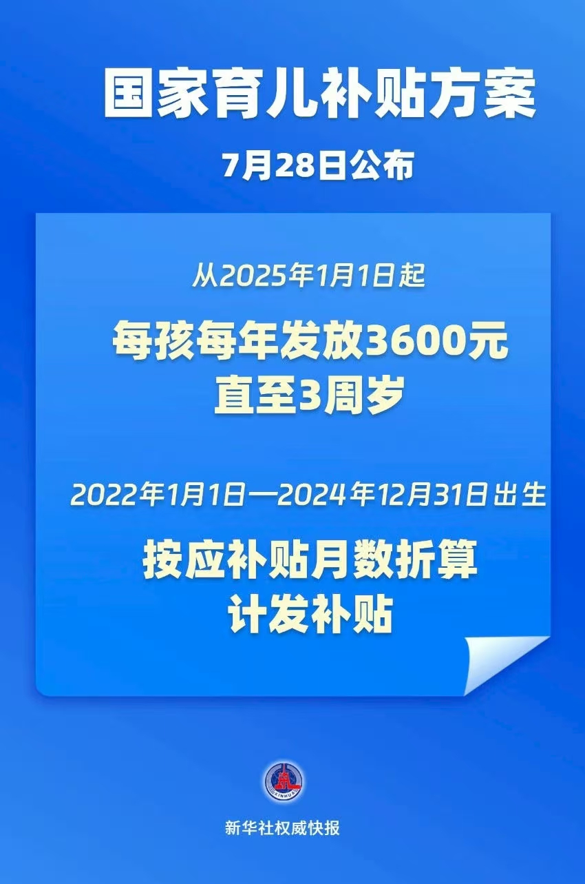 2025年7月28日,國家育兒補貼制度千呼萬喚始出來。按照公佈的方案,從2025年1月1日起,無論一孩、二孩、三孩,每年均可領取3600元補貼,直至年滿3週歲。
