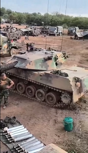 ▲泰國軍隊集結地的美式“黃貂魚”坦克,旁邊放的全都是脱殼穿甲彈