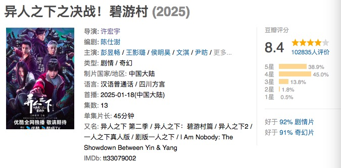 今年年初,少年幻單元再發力,《異人之下之決戰!碧遊村》征戰開年市場,不僅成為優酷2025首部破萬劇,豆瓣評分8.4分也是今年國產劇的最高分。