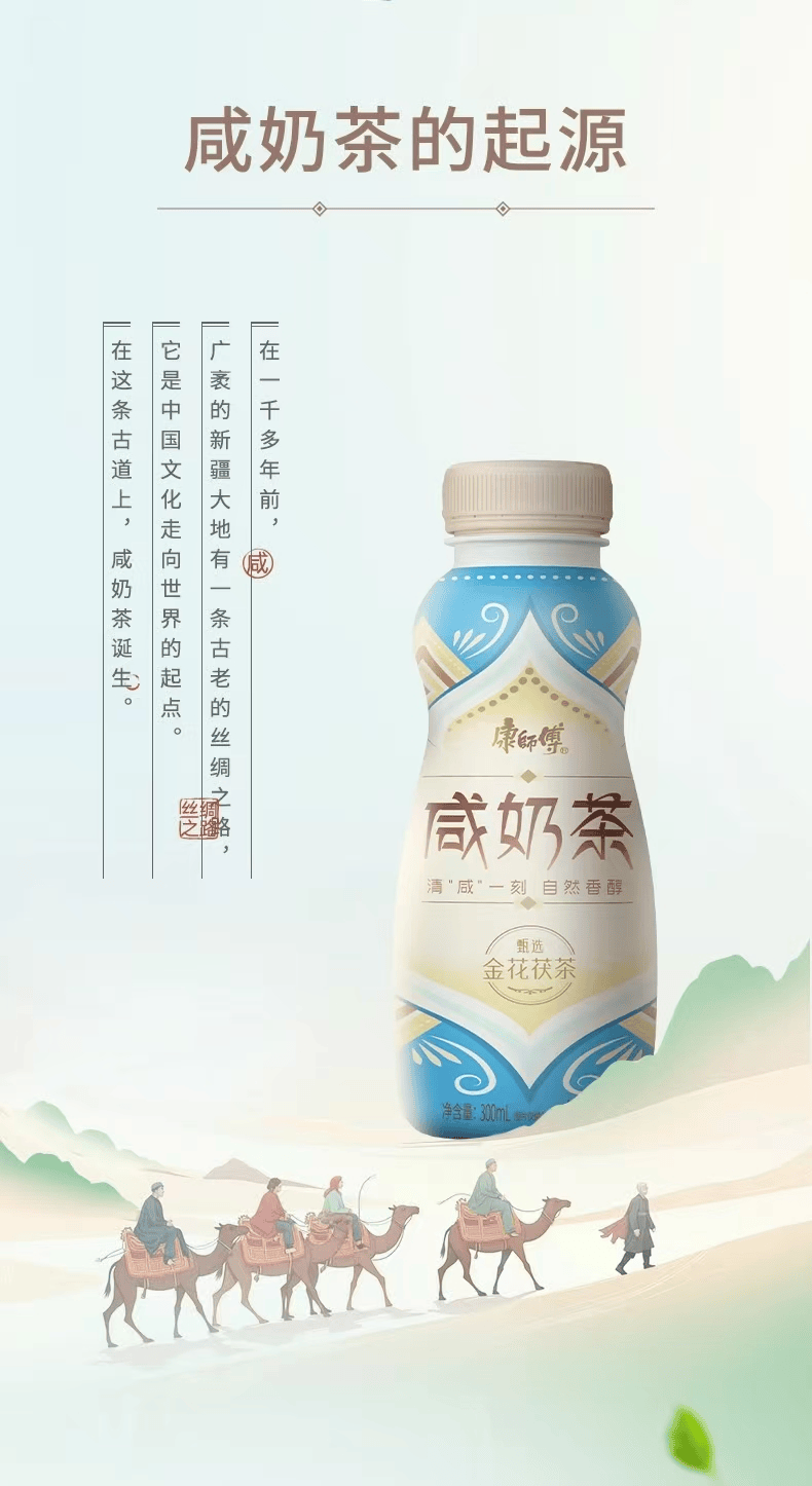 康師傅金花茯茶鹹奶茶是市場上首款瓶裝“鹽系”奶茶,靈感來源於西域鹹奶茶。這支鹹奶茶甄選金花茯茶,融入優質奶源,精選富含膳食纖維的糙米共煮萃取,口感香醇、可鹽可甜,為消費者帶來獨特的味覺體驗。