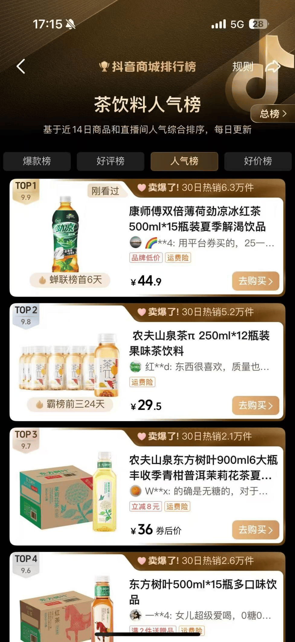 酷暑難耐?康師傅夏季限定雙倍薄荷勁涼冰紅茶,直擊靈魂的冰感來自雙倍的薄荷因子,疊加金銀花草本舒緩,成為年輕人對抗炎炎夏日、緩解高温不適的“夏日續命水”,上市首月即登頂抖音茶飲新品榜,抖音單一渠道月銷售近300萬元。