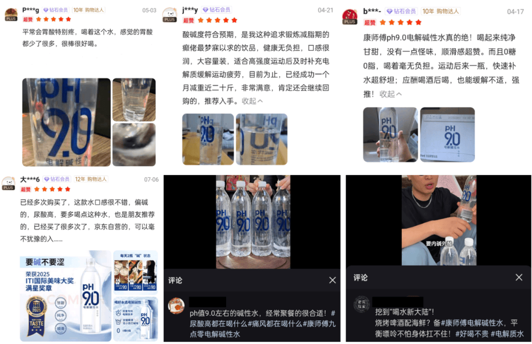 更為重要的是,這款水的“體感”被不少消費者所稱道,反饋中頻頻提及“大餐酒後清爽解膩”、“飯後脹氣感減少了”、“酒後喝很舒服”、“運動後恢復快”、……許多用户將9.0電解鹼性水當作聚餐、應酬、運動的新搭子。