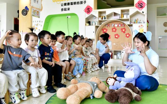 (7月22日,在山東省濱州市博興縣金色搖籃幼兒園,老師帶托育班的孩子做遊戲。圖片來源:新華社) 每年惠及2000多萬個家庭