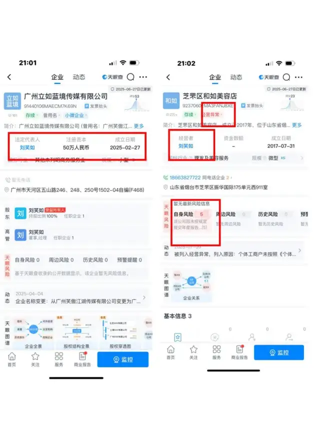 原來,劉某如發佈“維權連續劇”視頻的抖音、小紅書等賬號裏,其中一些認證單位為“廣州立如藍境傳媒有限公司”。天眼查顯示,該公司於今年2月27日註冊,註冊資金為50萬元,法人和百分百持股人均為劉某如。天眼查還顯示,該博主名下還登記了一家個體工商户的美容店“芝罘區和如美容店”,成立於2017年,位於山東煙台。