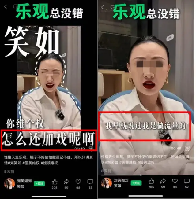 今年4月起,“劉某如”在抖音、小紅書、視頻號等平台,通過不同賬號,以《醫美維權連續劇》為主題,以本人出鏡的方式發佈了大量“維權”視頻。該博主稱,自己在廣州媛頌醫美機構花費56800元操作眼周童顏針項目,但對術後效果並不滿意,與媛頌協商多次均無果。