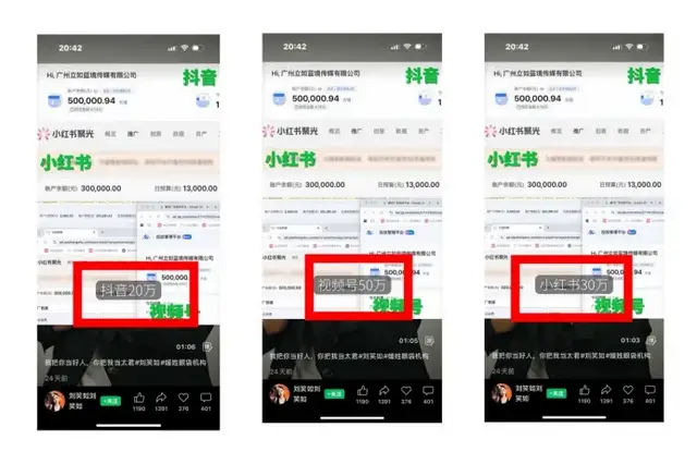 隨着“維權”事態的進展,部分美業博主和網友發現了其中的貓膩:“劉某如”在一條視頻中自曝一百萬元投放費用已到賬,投流抖音20萬元、騰訊視頻號50萬元、小紅書30萬元,甚至在視頻中直言“全部充滿彈藥”“專門定向你們機構”。