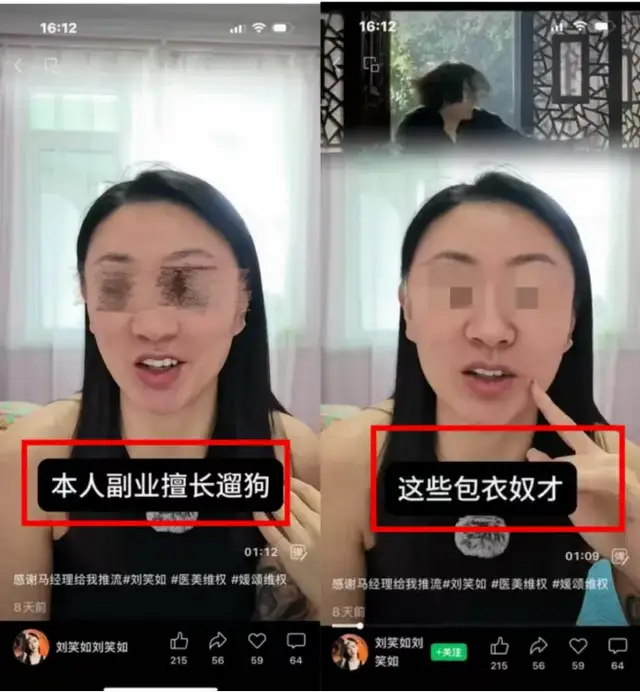 經調查發現,劉某如在“維權”過程中,通過多個賬號累計發佈了百餘條視頻,主要內容有兩類:一方面,該博主在視頻中提出一些服務爭議點,希望企業回覆;另一方面,該博主用大量貶損性語言,評價機構,如“黑心機構”“奴才”“打狗”等。
