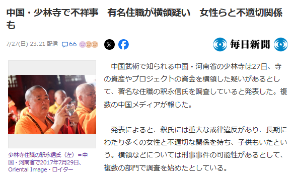 釋永信因為涉嫌挪用寺院資產,以及違反佛教戒律,與多名非婚女性發生不正當關係,並育有至少20名子女等問題被曝光。關於釋永信的新聞不僅在中國媒體上登上熱搜榜首,就連日本媒體都極其關注。