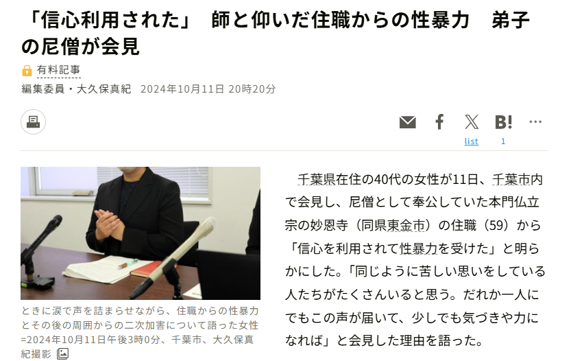 同樣是2024年,一名50歲左右的天台宗女性僧侶曝料四國地區一位60多歲的住持持續性侵了她14年,這位女性僧侶説,即使被住持脱去衣服,她也曾這樣安慰自己:“住持怎麼可能會有淫穢的念頭。”然而,這樣的性侵害在日常中卻反覆發生。