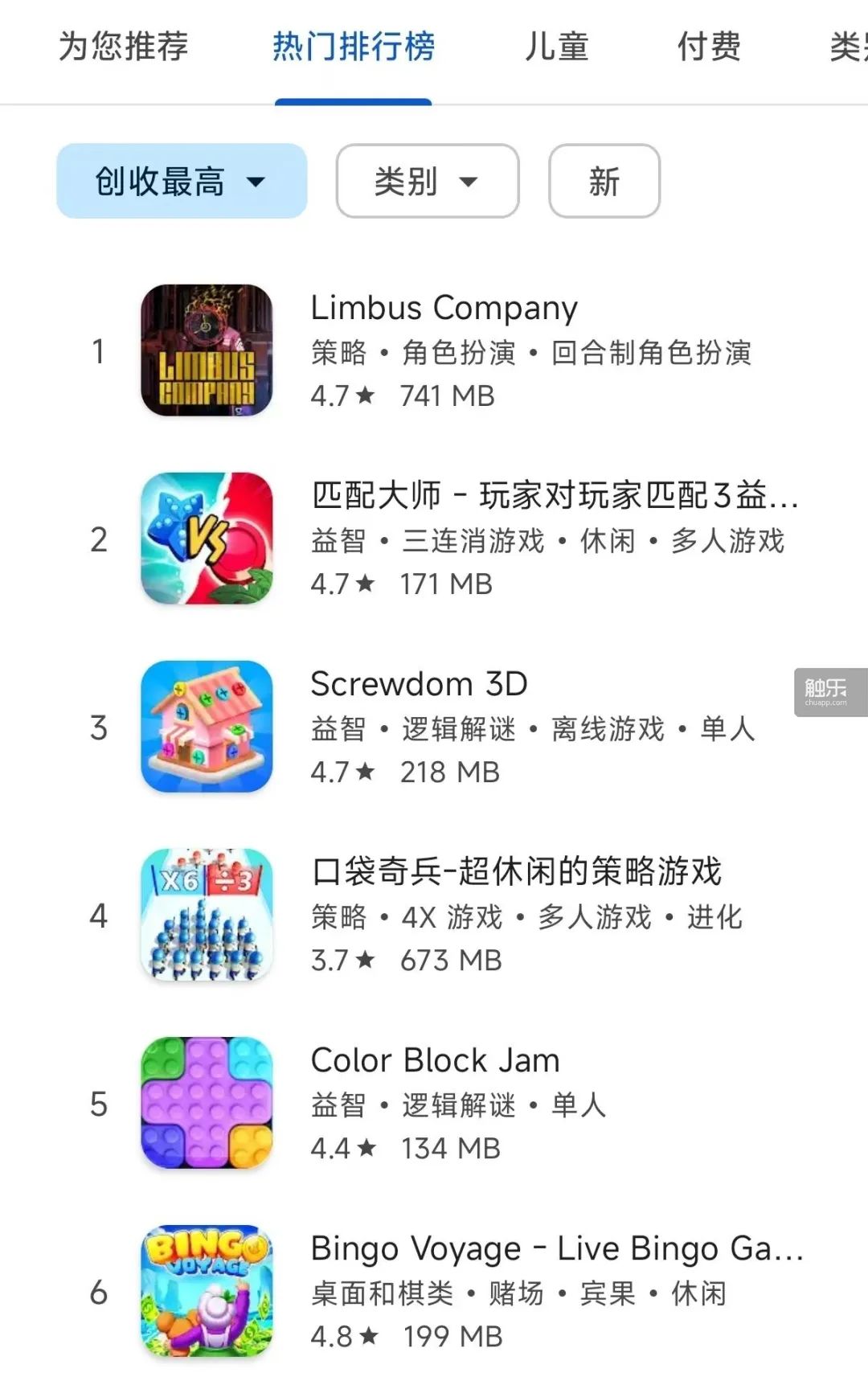 Google Play商店的“創收最高”排行榜中,大多都是休閒小遊戲