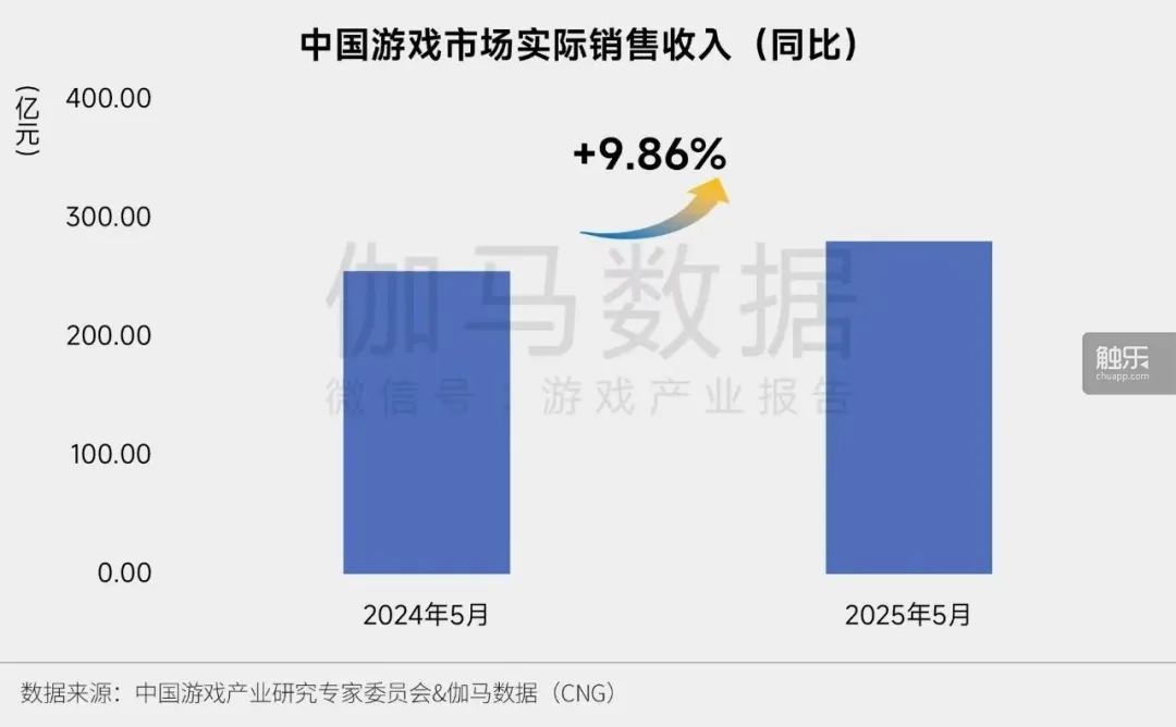 據伽馬數據統計,2025年5月中國遊戲市場實際銷售收入同比增長9.86%