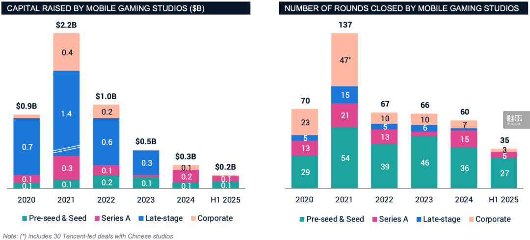 InvestGame在7月17日發佈的有關近5年遊戲投資的報告中總結説,移動遊戲投資熱潮在2021年達到頂峯,2021年後市場熱度驟降。2022年的融資金額和交易數量幾乎是2021年的一半。此後逐年下滑,到2025年上半年僅完成2億美元融資和35筆交易。