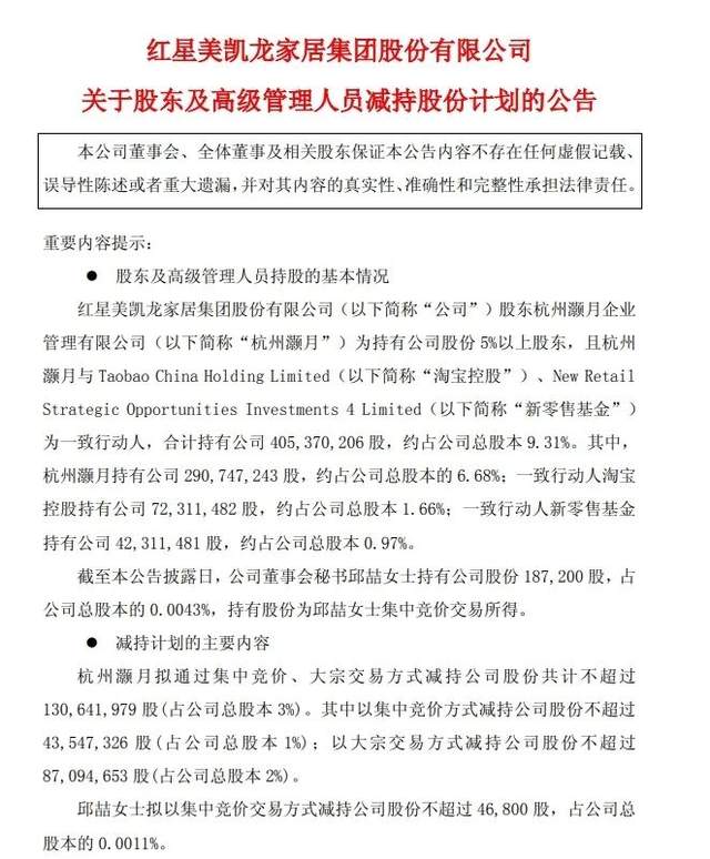 公開信息顯示,杭州灝月是持有公司5%以上股份的股東,且與淘寶控股、新零售基金為一致行動人,三者合計持有紅星美凱龍4.05億股,佔公司總股本的9.31%。