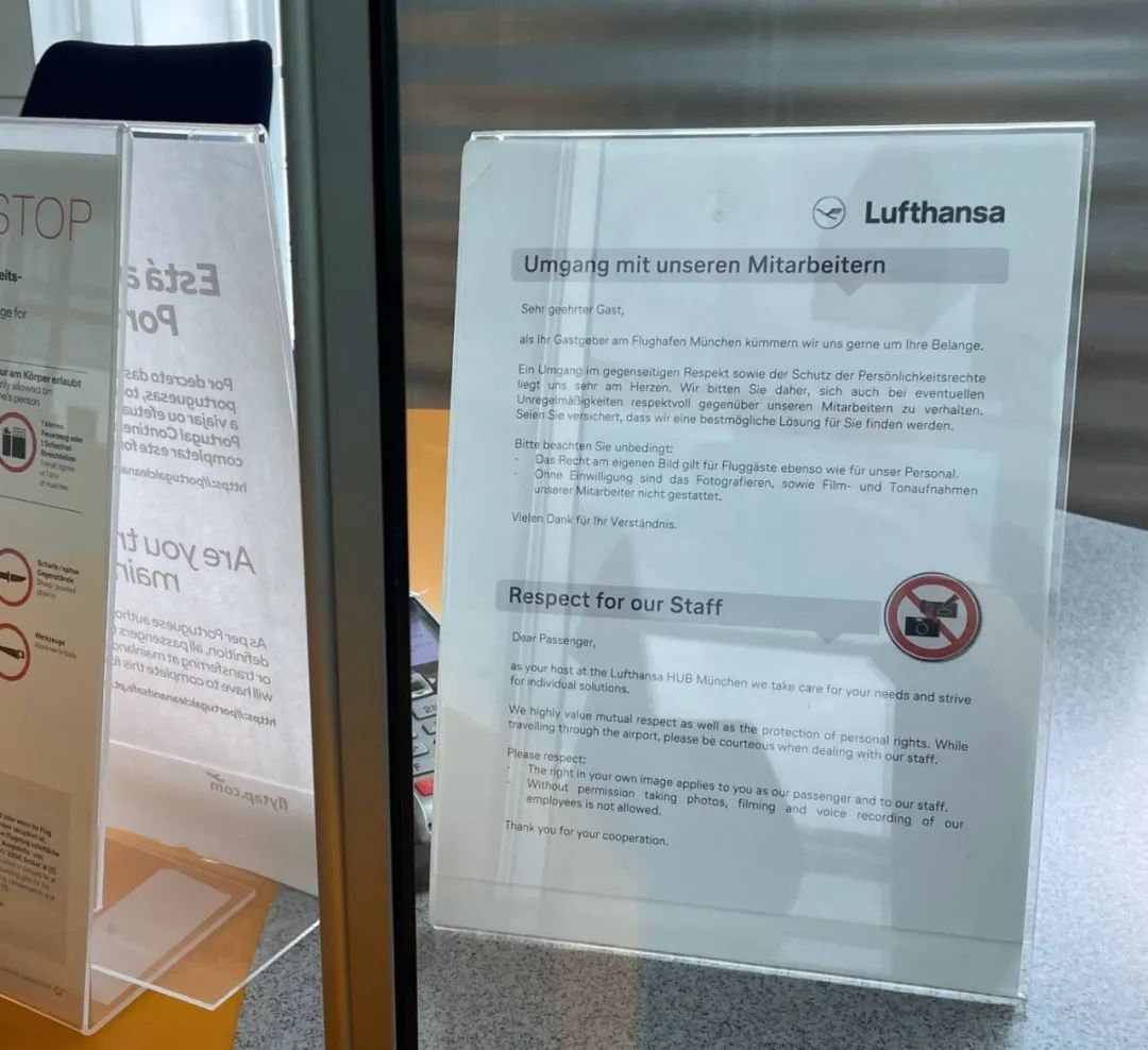 與我們中國民航相對應的,是外國航司對此事的態度,下面這張圖是歐洲老牌航司漢莎航空貼在登機口前的一張告示: