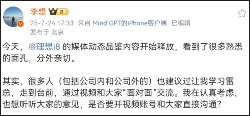 就在開通抖音賬號的前一天,李想曾發文透露,公司內外多人建議其“學習雷軍走到台前”。如今看來,是“從善如流”了。