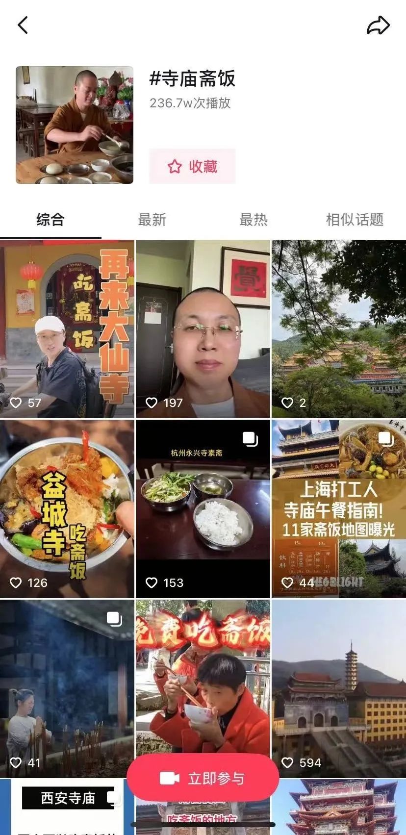 此外,在社交媒體上,“寺廟吃齋飯” 相關筆記超3萬篇、“寺廟咖啡”相關筆記超11萬篇,抖音上“寺廟齋飯”詞條播放量超2000萬次,寺廟餐飲已然成為新的流量密碼。