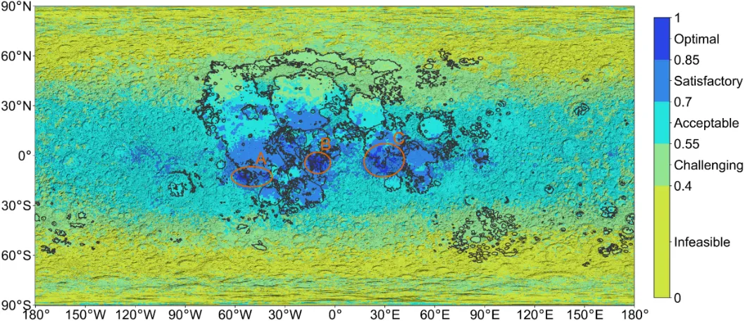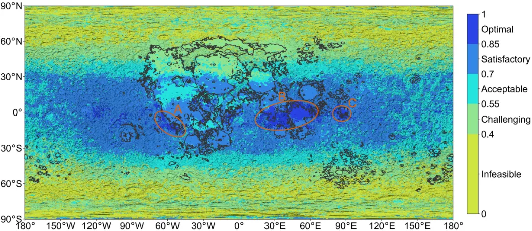 圖1 月球科研站選址全月適宜性分佈圖。A、B、C區域為工程地質條件適宜性最高的區域,A:風暴洋(Oceanus Procellarum)西南緣;B:豐富海(Mare Fecunditatis)、靜海(Mare Tranquillitatis)靠近赤道的區域及兩月海之間的高地區域;C:史密斯海(Mare Smythii)