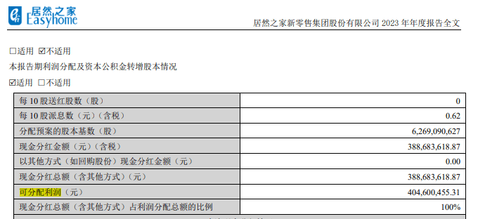 據居然智家歷年財報,2020年至2023年,公司對現金分紅金額(不含其他方式)分別為3.39億元、10.48億元、13.02億元和3.89億元,而同期可分配利潤分別約 3.41億元、10.49億元、13.49億元和4.05億元,分紅比例常年接近100%。