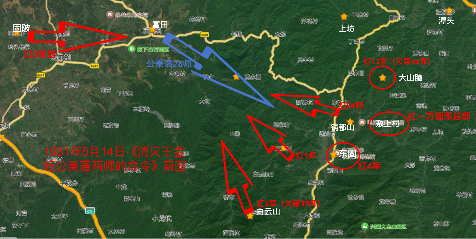 終於,飛機反覆偵察沒有在東固發現紅軍主力後,5月13日,王金鈺的部隊從富田出來,向東固運動了!接到偵察報告,朱毛立即向部隊下達了作戰命令: