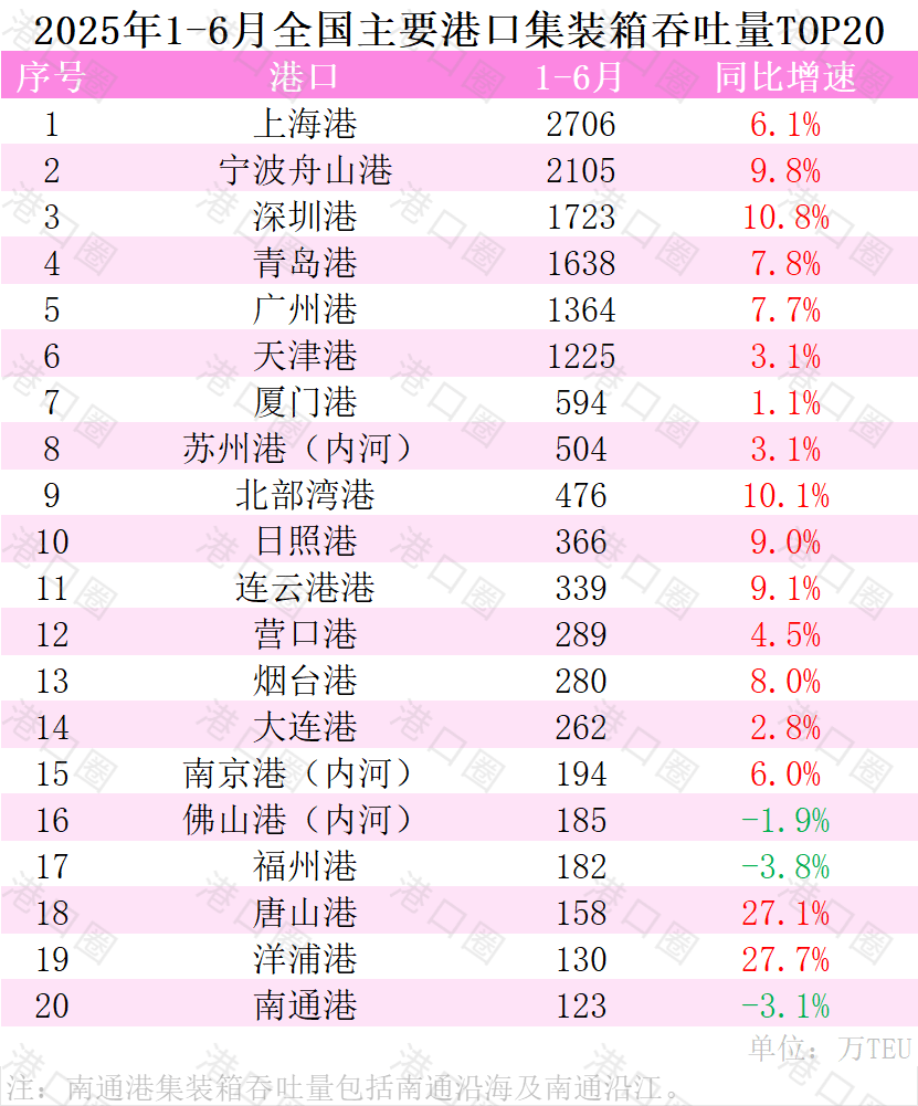 上半年,全國主要港口集裝箱吞吐量前十名為:上海港(第1)、寧波舟山港(第2)、深圳港(第3)、青島港(第4)、廣州港(第5)、天津港(第6)、廈門港(第7)、蘇州港(第8)、北部灣港(第9)、日照港(第10)。
