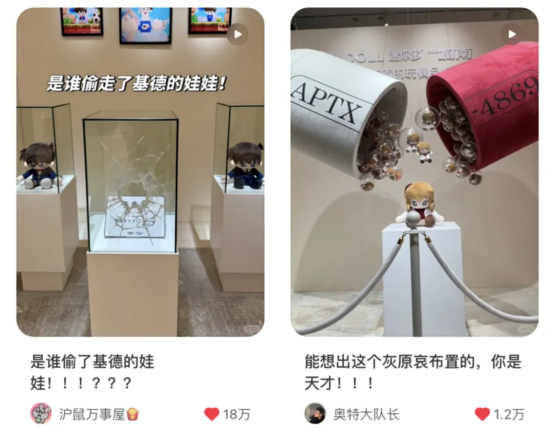 **在內容厚度和打動力面前,傳統的限量稀缺營銷招數也黯然。**很多粉絲被內容打動,自發在社交媒體發佈分享心得。小紅書上相關討論單條筆記最高點贊達18萬,有關各IP的討論度也持續走高。單是柯南展區"飛天基德"的視頻就在社交平台斬獲百萬播放。截至目前,小紅書單一平台藝術展話題曝光在近三千萬。