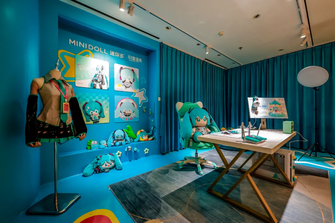“二次元盧浮宮”的靈感概念由此落地。首先是空間規劃,項目總面積有1000平,品牌拿出了一半以上的面積用來做沉浸式體驗。在外廣場,MINIDOLL搭建了高9米的巨型初音未來作為引流打卡點,這也是截至目前國內最大的初音未來角色雕像,其形象來自於MINIDOLL品牌設計風格的miku玩偶形象。